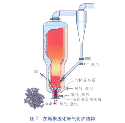 灰熔聚流化床氣化爐采用傳質、傳熱效率較高的流化床處理粉煤,粉煤與氣化劑在底部濃相區進入氣化爐即開始發生反應,煤在氣化爐內一次實現破粘、脫揮發分、氣化、灰團聚及分離、焦油及酚類的裂解等過程,煤熱解與氣化產生的煤氣均通過了高溫區域發生裂解,幾乎不產生焦油、酚類物質及有機硫化物。