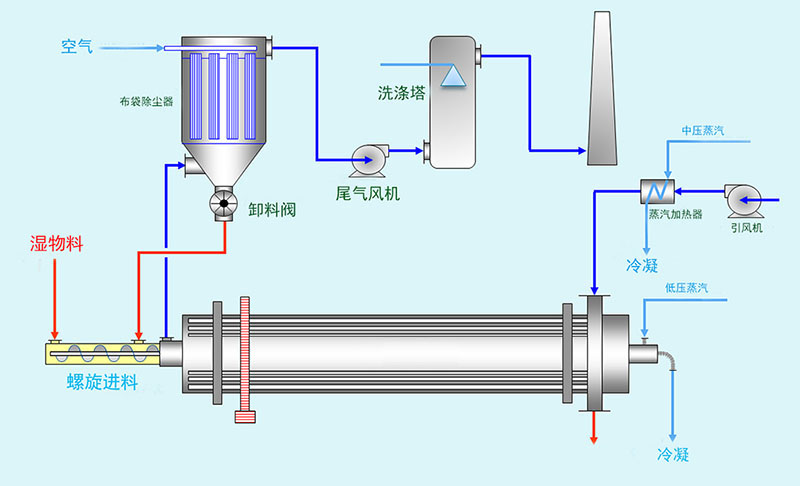 芝麻烘干機利用熱傳導和熱輻射原理,蒸汽在管束內與物料呈逆流或順流方式,物料在負壓封閉腔內通過管束上的鏟板攪拌和推動,由進料端向出料端移動,一部分成品物料通過卸料槽到卸料螺旋,經排料關風機排出。另一部分成品物料通過返料關風機到混料螺旋,經輸送攪拌機與濕物料充分攪拌混合,降低原始濕物料的含水量,達到干燥機的理想工作條件。